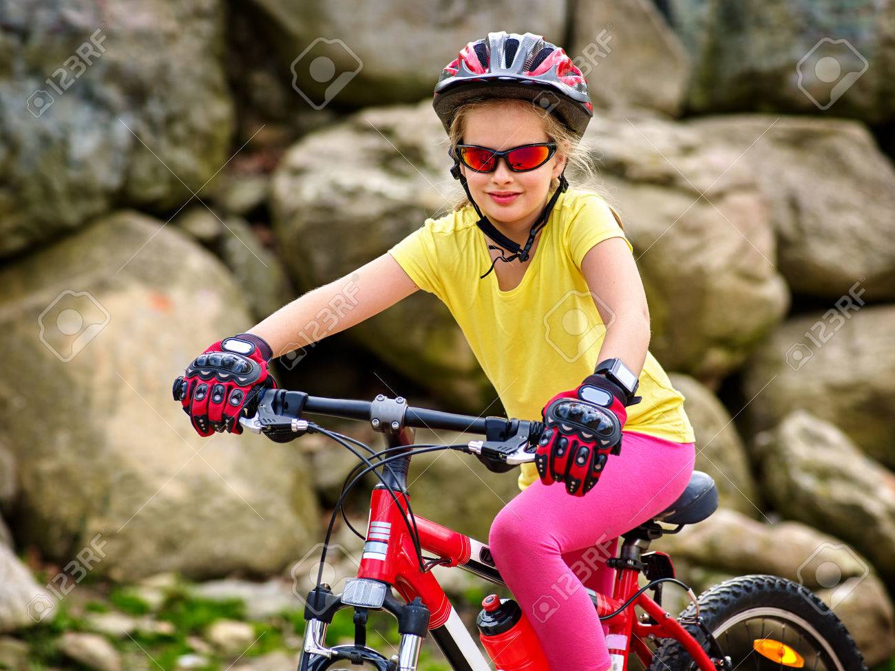 Nina De Paseos En Bicicleta En Las Montanas La Muchacha Llevaba Casco Y Guantes En La Bicicleta En El Montanismo Recorrido De La Bicicleta De Montanismo Es Bueno Para La Salud Fotos